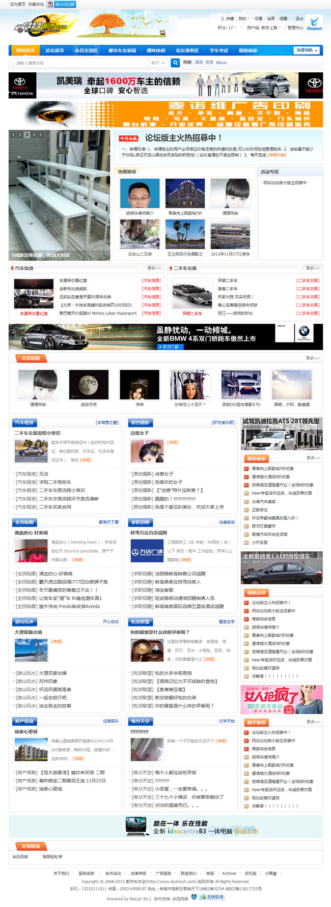 都市車(chē)友會(huì)是蚌埠地區(qū)最具影響力的百姓生活信息網(wǎng)絡(luò)平臺(tái),擁有超過(guò)4萬(wàn)的注冊(cè)會(huì)員,承辦過(guò)“珠城十佳人民警察”評(píng)選、“雙十佳”法官檢察官評(píng)選、十佳律師評(píng)選、“珠城百姓口碑榜”評(píng)選、“心動(dòng)2011——讓我們邂逅在龍子湖畔”大型交友聯(lián)誼會(huì)等大型活動(dòng)。