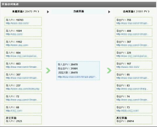 訪客經常在網(wǎng)站中的各個頁面之間跳轉,訪問的路徑不勝枚舉,但可以通過觀察焦點頁面及其上下游頁面,掌握訪客的來路和去向,發(fā)現(xiàn)較普遍的訪客訪問習慣。頁面訪問軌跡即用來完成該功能,用戶可自由指定觀察焦點頁面,系統(tǒng)會列出該頁面的前十位來路頁面和去向頁面。對觀察焦點頁面而言,其自身的導入、導出PV的多少能夠反映出該頁面在網(wǎng)站的權重地位,而通過觀察來源和去向頁面又能最大限度的了解到訪客的行為習慣及興趣點。