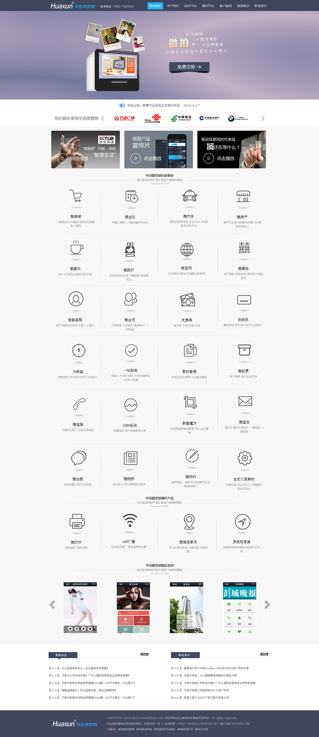 華迅網(wǎng)絡(luò)是打造一個(gè)專(zhuān)門(mén)針對(duì)微信公眾賬號(hào)提供營(yíng)銷(xiāo)推廣服務(wù)的第三方平臺(tái)。主要功能是針對(duì)微信商家公眾號(hào)提供與眾不同的、有針對(duì)性的營(yíng)銷(xiāo)推廣服務(wù)。通過(guò)華訊微網(wǎng)站平臺(tái),用戶可以輕松管理自己的微信各類(lèi)信息,對(duì)微信公眾賬號(hào)進(jìn)行維護(hù)、開(kāi)展智能機(jī)器人、在線發(fā)優(yōu)惠劵、抽獎(jiǎng)、刮獎(jiǎng)、派發(fā)會(huì)員卡、打造微官網(wǎng)、開(kāi)啟微團(tuán)購(gòu)等多種活動(dòng),對(duì)微信營(yíng)銷(xiāo)實(shí)現(xiàn)有效監(jiān)控,極大擴(kuò)展?jié)撛诳蛻羧汉蛯?shí)現(xiàn)企業(yè)的運(yùn)營(yíng)目標(biāo)。華迅微網(wǎng)站平臺(tái)很好的彌補(bǔ)了微信公眾平臺(tái)本身功能不足、針對(duì)性不強(qiáng)、交互不便利的問(wèn)題,為商家公眾賬號(hào)提供更為貼心的、且是核心需求的功能和服務(wù)。在線優(yōu)惠劵、轉(zhuǎn)盤(pán)抽獎(jiǎng)、微信會(huì)員卡等推廣服務(wù)更是讓微信成為商家推廣的利器。智能客服的可調(diào)教功能讓用戶真正從微信繁瑣的日常客服工作中解脫出來(lái),真正成為商家便利的新?tīng)I(yíng)銷(xiāo)渠道。