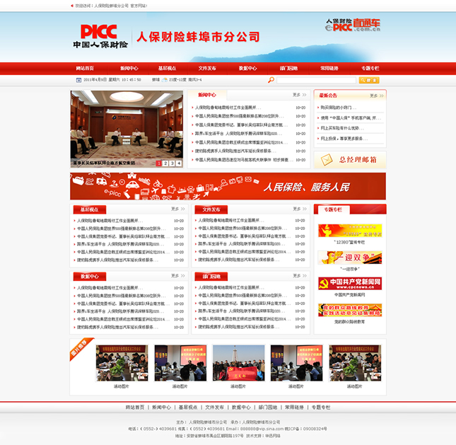 人保財(cái)險(xiǎn)蚌埠市分公司,以科學(xué)發(fā)展觀為統(tǒng)領(lǐng), 加強(qiáng)精細(xì)化管理,基本實(shí)現(xiàn)公司發(fā)展與市場同步,近年呈現(xiàn)快速、有效、可持續(xù)健康發(fā)展勢態(tài)。在2011年政風(fēng)行風(fēng)建設(shè)評(píng)議中,人保財(cái)險(xiǎn)蚌埠市分公司名列參加評(píng)比保險(xiǎn)業(yè)各公司之首, 獲蚌埠市2010—2011年度“優(yōu)質(zhì)服務(wù)先進(jìn)單位”榮譽(yù)稱號(hào)。 2011年, 賠款支出1.22 億元,為蚌埠經(jīng)濟(jì)建設(shè)和創(chuàng)和諧社會(huì)做出較大貢獻(xiàn)。