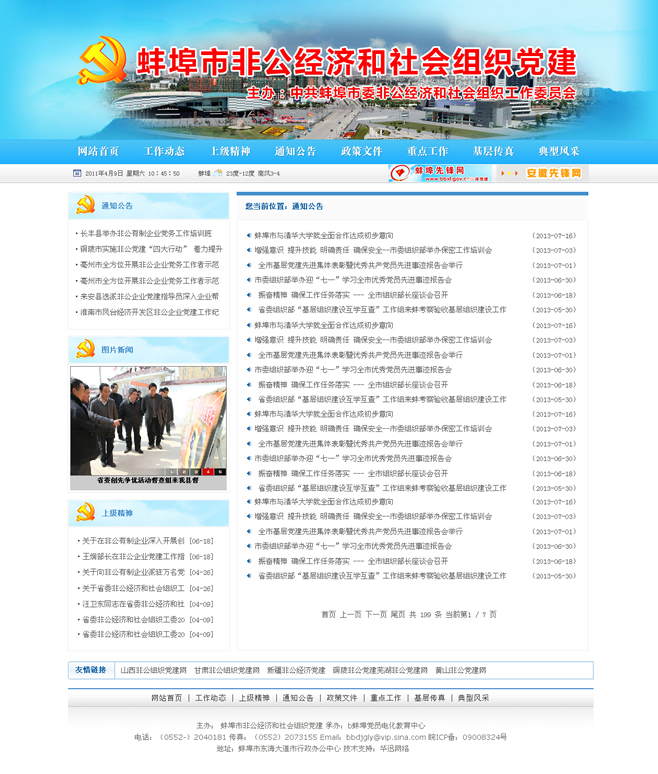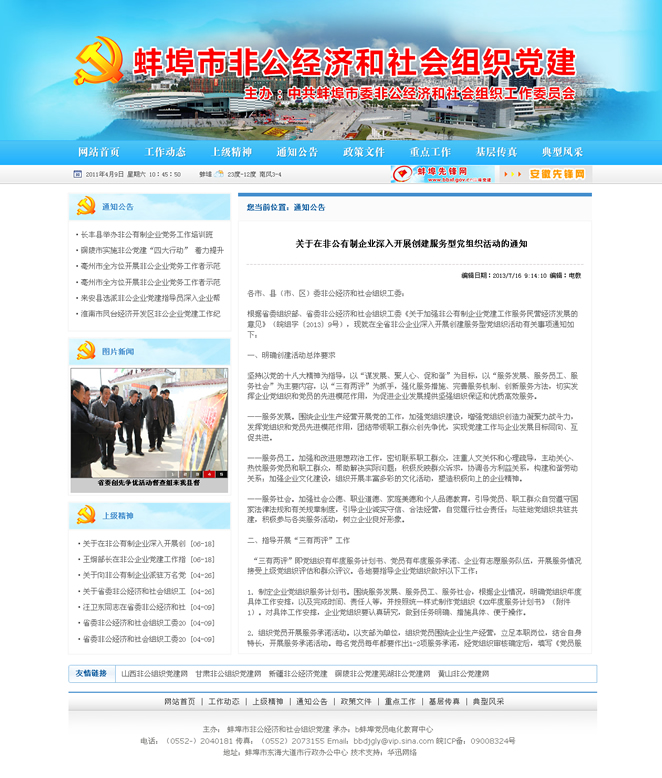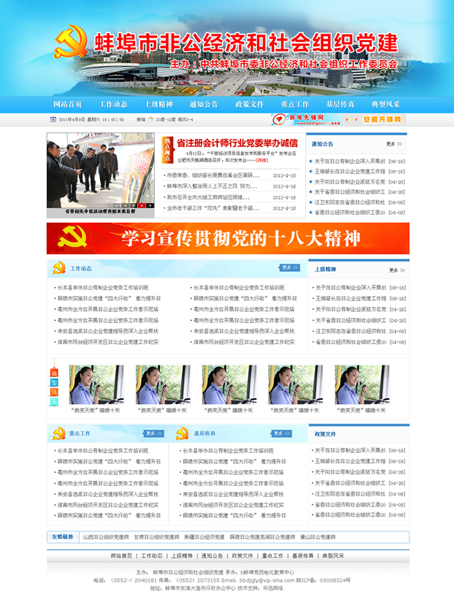 網(wǎng)頁(yè)由中共蚌埠市委非公經(jīng)濟(jì)和社會(huì)組織工作委員會(huì),蚌埠先鋒網(wǎng)電教中心承辦,作為蚌埠先鋒網(wǎng)子欄目,主要用于蚌埠非公經(jīng)濟(jì)和社會(huì)組織黨建工作有關(guān)信息發(fā)布和經(jīng)驗(yàn)交流。